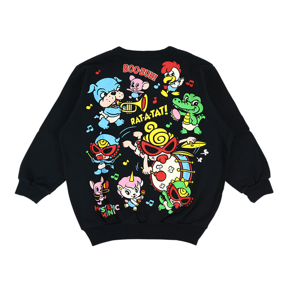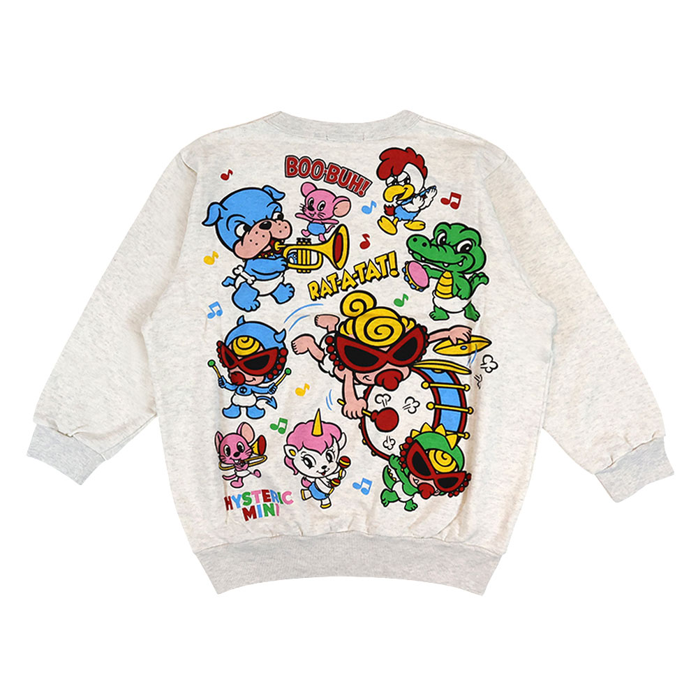 ★こちらの商品はHysteric Mini Direct Webでは販売いたしません。★ HYS-MINI BAND CLUBのメンバーが大集合☆今にも楽し気なMUSICが聴こえてきそうなキュートな裏毛トレーナーです。バックスタイルがなんと言っても一押しなお勧めアイテム☆ 【サイズ】 90cm/100cm/120cm/140cm 【素材】 コットン100%